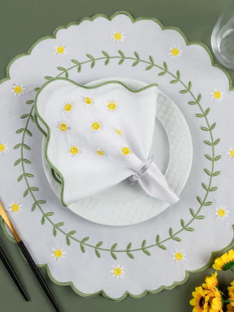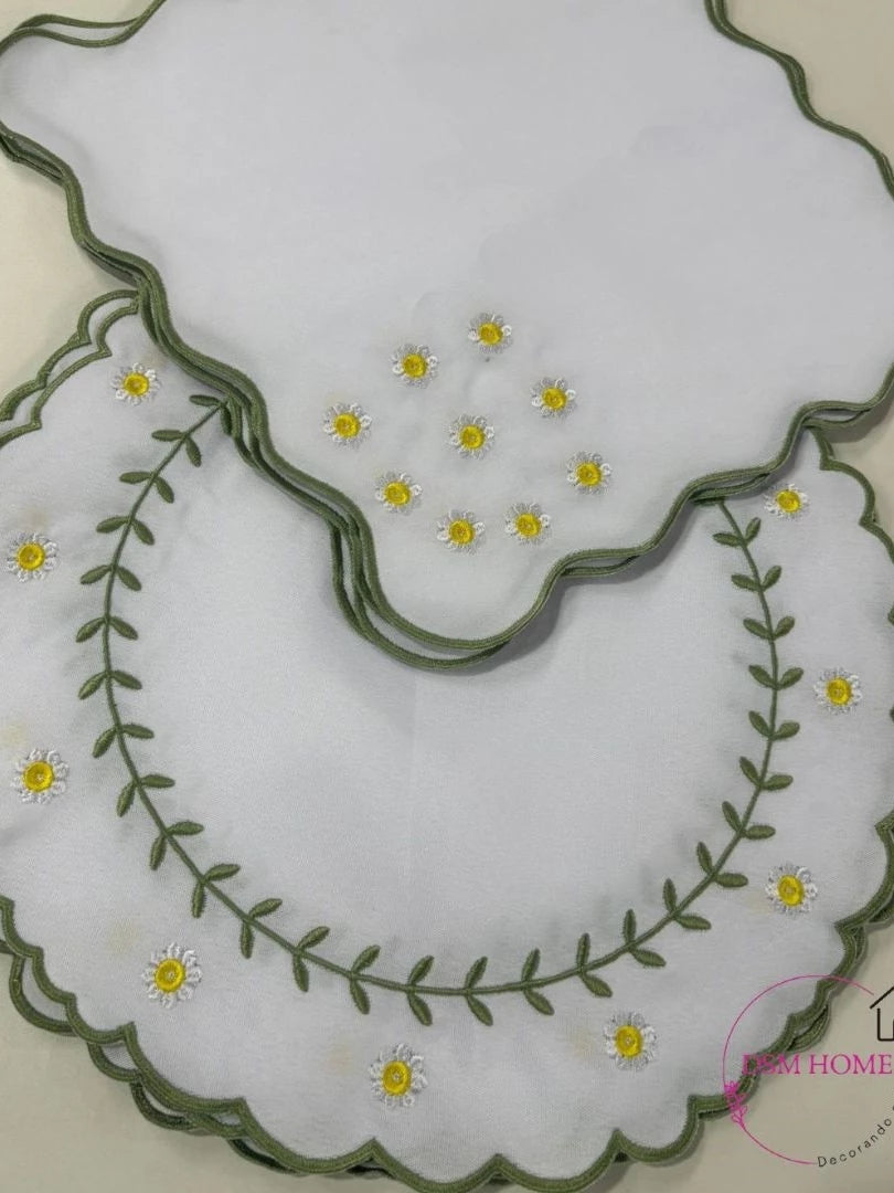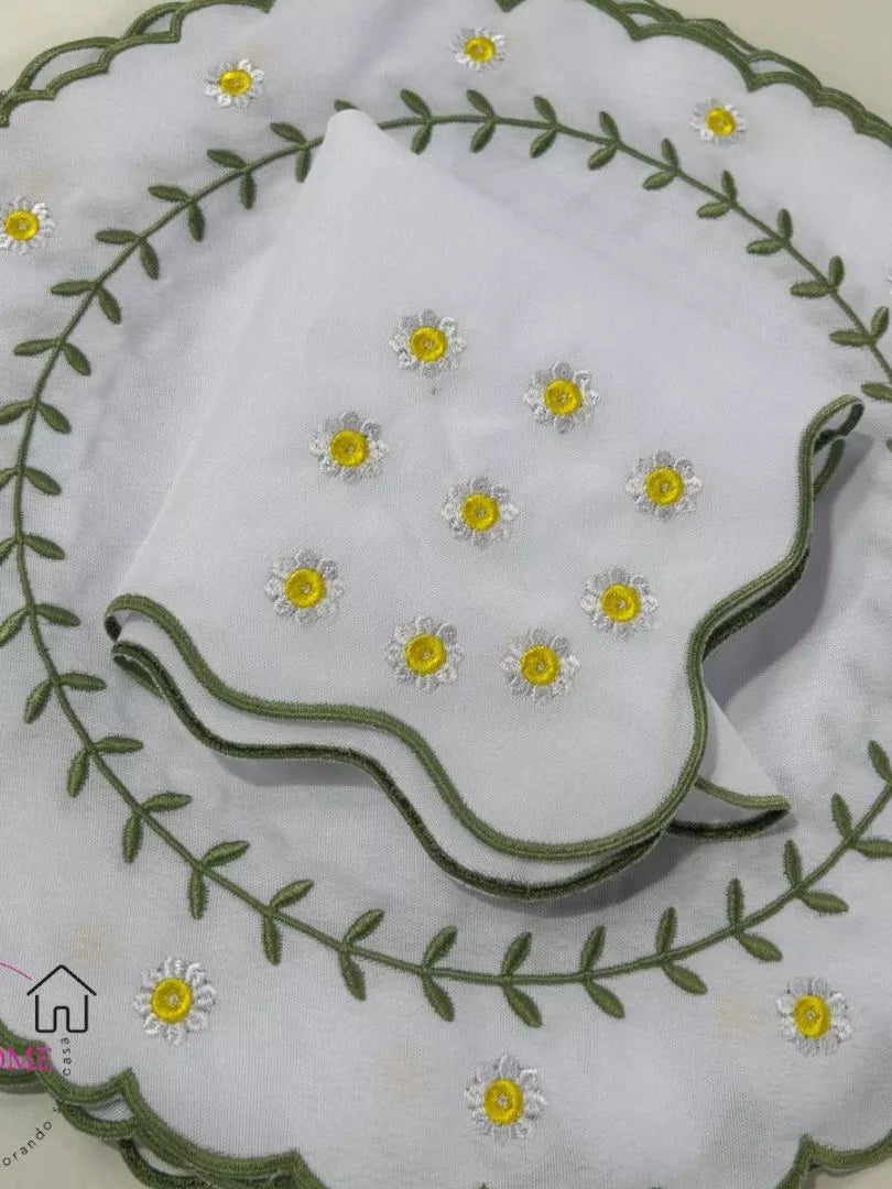 Os detalhes bordados deixam esse conjunto mais elegante e sofisticado, e sua mesa mais convidativa.
