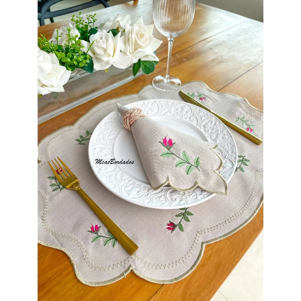 A Delicadeza do bordado e das flores, trazem para sua mesa um sensação de bem estar e cuidado.